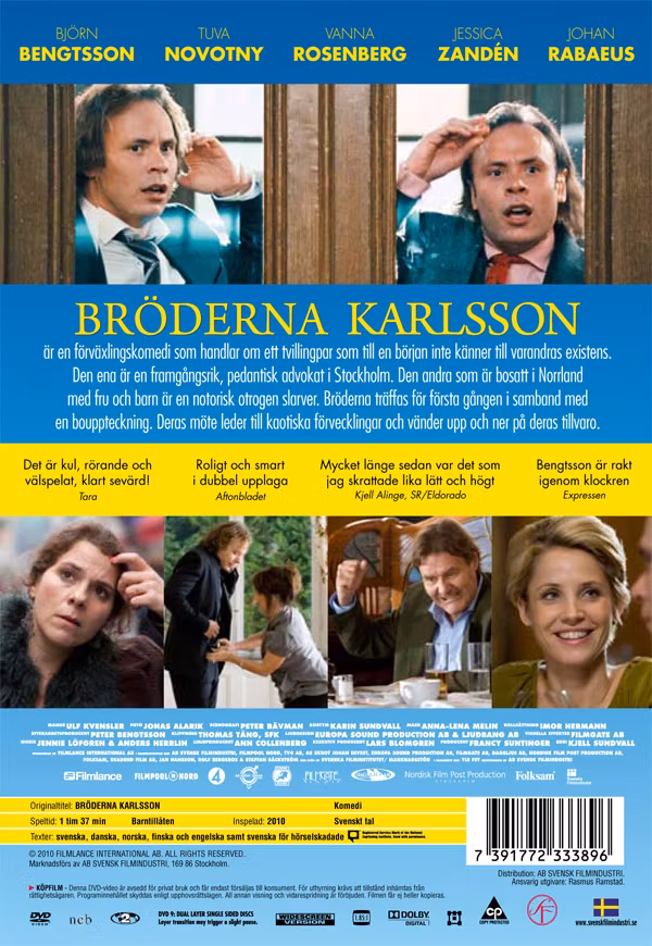 BRÖDERNA KARLSSON är en förväxlingskomedi som handlar om ett tvillingpar som till en början inte känner till varandras existens. Den ena är en framgångsrik, pedantisk advokat i Stockholm. Den andra som är bosatt i Norrland med fru och barn är en notoriskt otrogen slarver. Bröderna träffas för första gången i samband med en bouppteckning. Deras möte leder till kaotiska förvecklingar och vänder upp och ner på deras tillvaro. | |